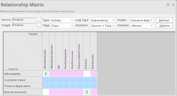 This illustration shows how the Relationship Matrix can be used to quickly locate gaps in the decision graph by visualizing decisions without any Data Inputs. The matrix can be used to find gaps or duplications between any other related elements such as Business Knowledge Models without corresponding Knowledge Authorities. The Traceability window shows another way of visualizing the Decisions and their relationships to other elements such as Requirements. Both windows allow you to locate the elements in the Browser window and any diagrams that contain the objects.