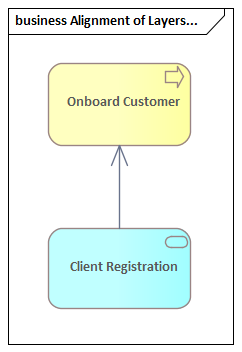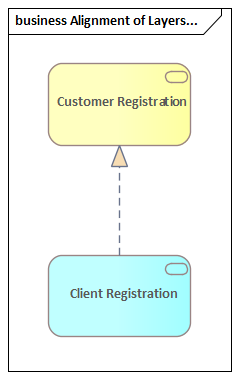 Realization relationships can be used to connect an application layer element to a business layer element for example an application process or function can be said to realize a business process or function, or a data object or a technology object can be said to realize a business object, so as to indicate that the data object is a digital representation of the corresponding business object, or the technology object is a physical representation of the business object. The relationship is always drawn in the direction from the lower layer with the arrow pointing to the higher layer.
