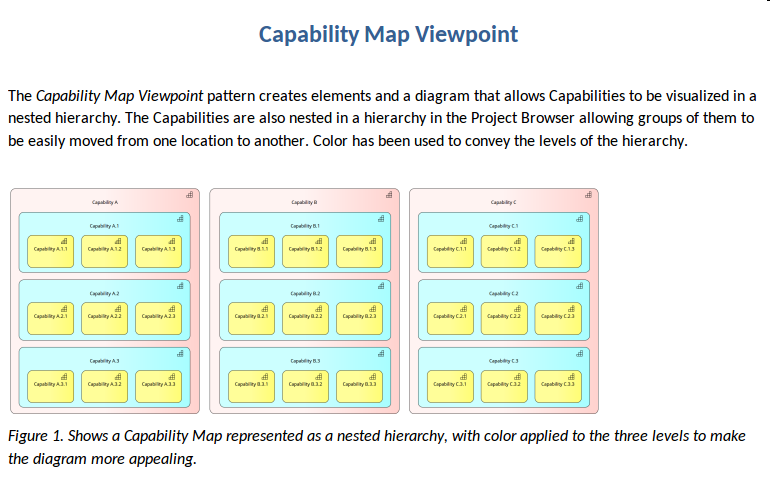 The pattern documentation provides a detailed description of the pattern (in this case a viewpoint) and an example diagram that shows the user what will be generated, including the model content and details of how to use the pattern. This illustration shows the documentation for one of the most important Strategy Viewpoints - the Capability Map viewpoint, which allows Business Architects to create a structured overview of the capabilities of the enterprise.