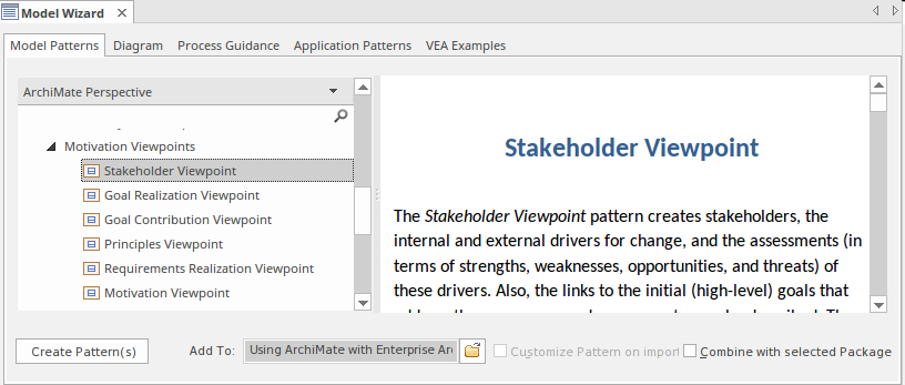 The ArchiMate language defines a series of example viewpoints designed to provide representations that are meaningful and relevant to a variety of stakeholders. These viewpoints are made available in Enterprise Architect through the Model Wizard patterns, which provide a way of creating both repository content and diagrams that show how the elements are connected by relationships. Thus new diagrams can be created.
