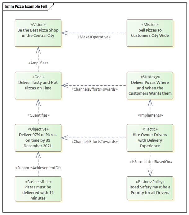 You can re-create a similar diagram from the 'BMM Example - Pizza Company' Pattern on the 'Business Motivation Perspective' page of the 'Model Patterns' tab of the Model Wizard.