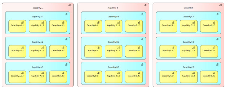 The Capability Map Viewpoint pattern creates elements and a diagram that allows Capabilities to be visualized in a nested hierarchy. The Capabilities are also nested in a hierarchy in the Project Browser allowing groups of them to be easily moved from one location to another. Color has been used to convey the levels of the hierarchy.