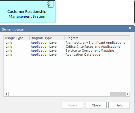 Selecting this option provides a list of all the diagrams that contain the element, allowing you to hyperlink and open any of the listed diagrams. This provides a convenient way to understand the basis for the element's usage, as the diagram's type and name are included in the table of usages.