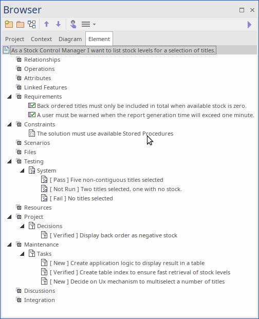 Shows Requirements (and other element types) in a simple text format, and helps the modeler to create, edit and manage these elements. The Specification Manager will be the preferred tool for many Requirement Analysts as it allows the modeler to work in a familiar spreadsheet-like interface, to edit requirement properties such as Status, Priority and Difficulty using drop-down lists, and to add notes to the Requirements without needing to draw diagrams.