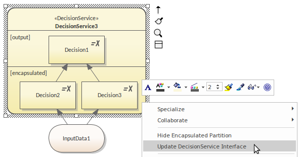 We can create a Decision Service element from the DMN pages of the Diagram Toolbox, and toggle [output] and [encapsulated] partitions from the context menu.