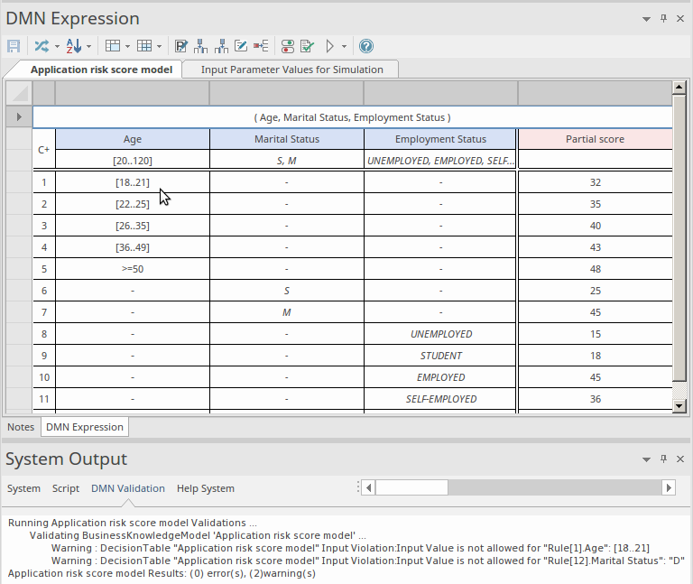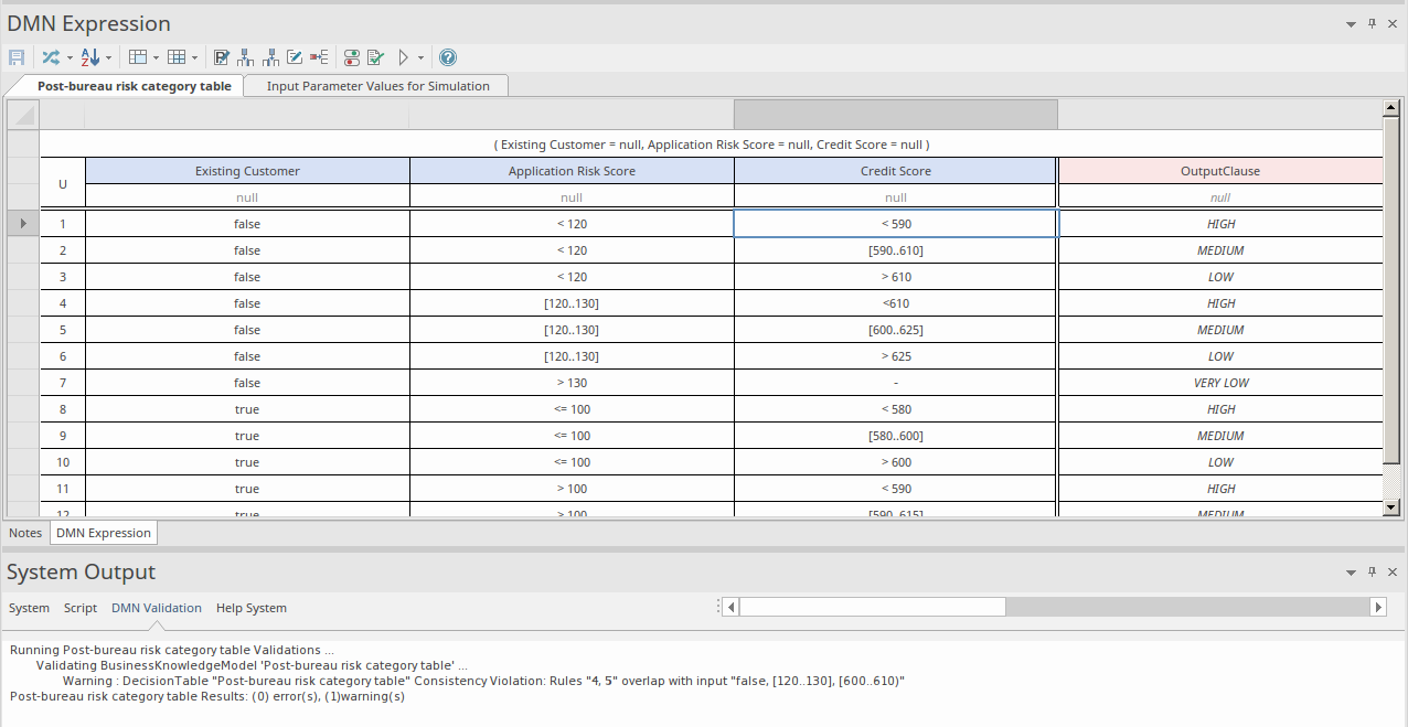 A Decision Table is one of the most common and powerful DMN Expressions used to express decision logic. However, modeling a Decision Table can also be complicated, especially if multiple Input Clauses are used in combination for many Decision Table rules. Enterprise Architect provides the facility to validate Decision Tables, as explained in this topic.