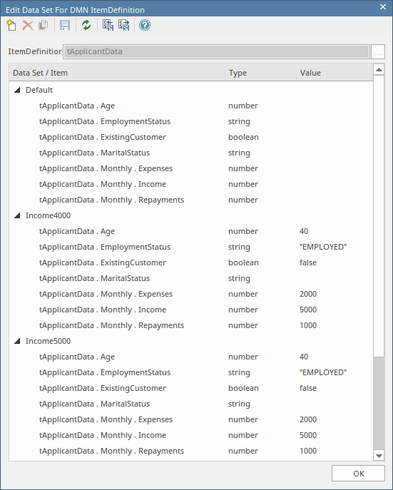 When testing code generated from a DMN model, or when simulating Business Process Model and Notation (BPMN) models that call DMN models, you need a means of exchanging data sets. For example, in a BPMN call of a DMN model, a BPMN DataObject is used to store the set of variables that will be passed on to the DMN model that it is calling. This DataObject needs to be populated with data fitting the DMN InputData's data structure ready to be passed to that InputData object. This same BPMN DataObject is used when testing the code generated from a DMN model.
