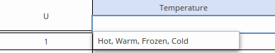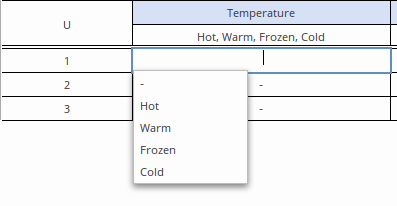 Once the 'Allowed Values' field is defined, as well as restricting the values that can be used when defining the rules in the table, the 'Allowed Values' field also provides the user with a fast fill option. This is invoked, in a rule cell, by pressing the Spacebar and selecting the required item: