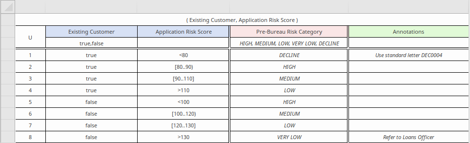 Rule-as-Crosstab format, where the rules are formed from inputs defined as a set of rows AND a combination of columns, with outputs set in the intersecting cells. (Note that this format hides the 'Annotation' fields):