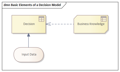 The DMN decision requirement model consists of a Decision Requirements Graph (DRG) depicted in one or more Decision Requirements Diagrams (DRDs). The elements modeled are decisions, areas of business knowledge, sources of business knowledge, input data and decision services.