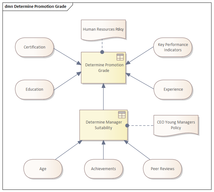 - For decision requirements modeling, it defines the concept of a Decision Requirements Graph (DRG) comprising a set of elements and their connection rules, and a corresponding notation: the Decision Requirements Diagram (DRD).