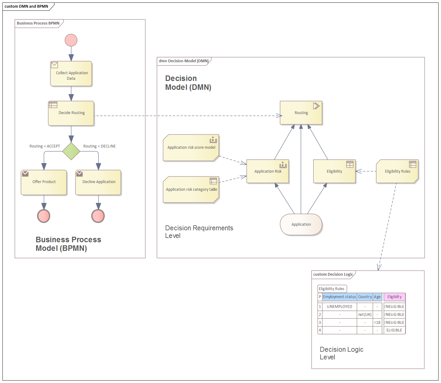 Taken together, Decision Requirements diagrams and decision logic allow you to build a complete Decision Model that complements a business process model by specifying - in detail - the decision-making carried out in process tasks.