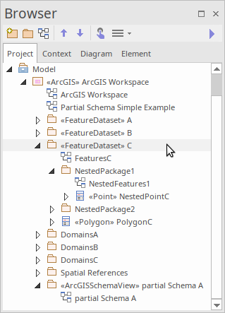 Finally, if you want to create a partial schema that includes only the elements in, say, NestedPackage1, you can model the scenario as a partial schema Package that refers to nested Packages within a Feature Dataset.