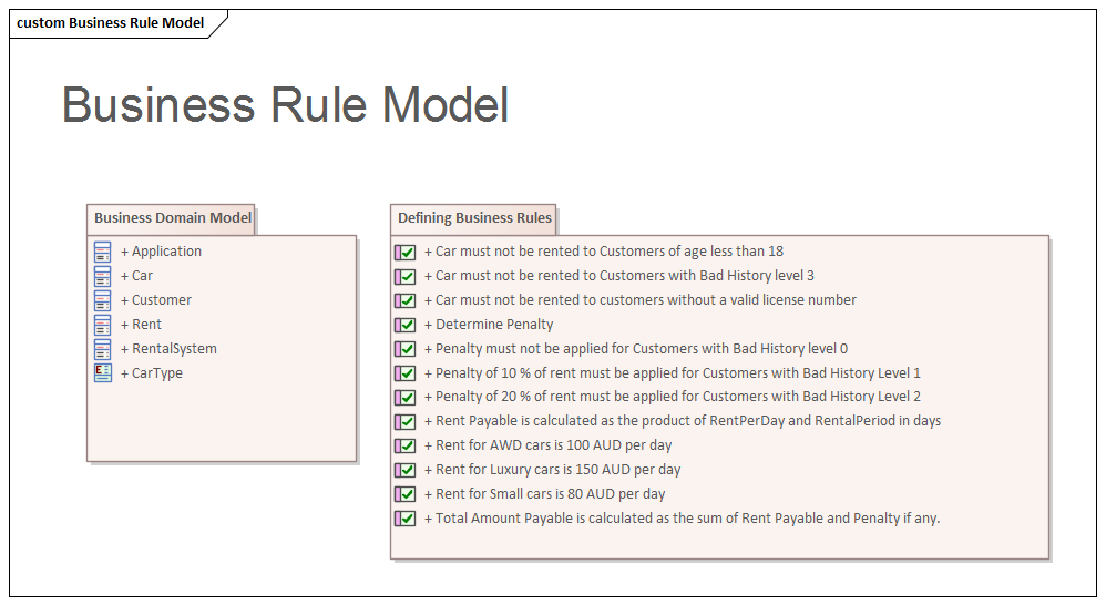 - To see an example of a Business Rules model, open the EAExample model provided with the installer, and expand: