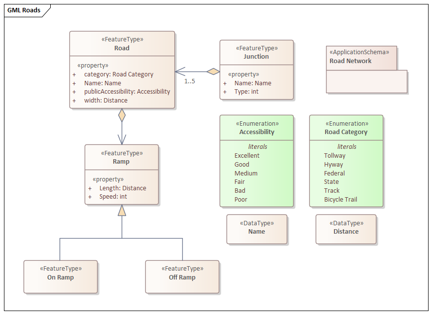 GML Model of roads showing two Feature with properties that access two Data Types and Enumerations