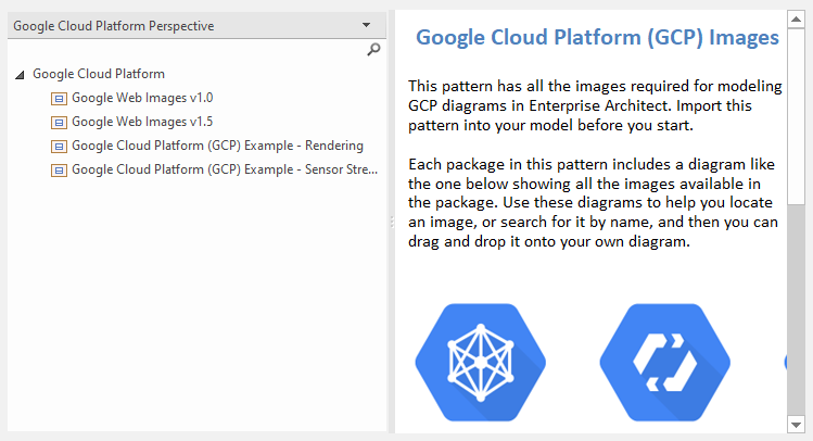 In the Model Wizard there are example patterns that show typical use of the images in diagrams, reproduced from the 'Google Cloud Platform' Powerpoint.