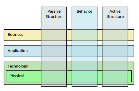 The reference structure used to classify elements of the ArchiMate core language is implemented in Enterprise Architecture in its core internal metamodel. It consists of three layers and three aspects (including the physical) and the extended framework contains a number of extra layers and aspects. as extensions. These core and extended anguage elements are visible in the tool in the form of the Diagram list and tool boxes corresponding to the layers and in the element representations with their various forms including the icon format. The following diagram has been created in Enterprise Architect to demonstrate the structure of the language