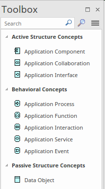 The tool supports the concept of Aspects, which fundamentally divide the corpus of elements into syntactic groups based on grammatical roles. The Aspects allow the modeler and the viewer to understand the model and diagrammatic constructs in terms of the role they play. The Aspects are Active Structure, Behavior, Passive Structure and Motivation. These are visible throughout the tool's implementation of ArchiMate in the Diagram Toolbox, which make new elements available to be added to the model and diagrams.
