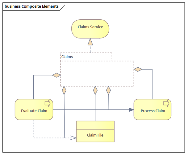 In this diagram we see elements from a number of different layers, using a number of different relationships, including nesting as an alternative. Some of the elements are presented using their rectangular style and others (e.g. Application Services) are presented using their icon style. The style can be toggled in Enterprise Architect to suit the audience and stakeholders.