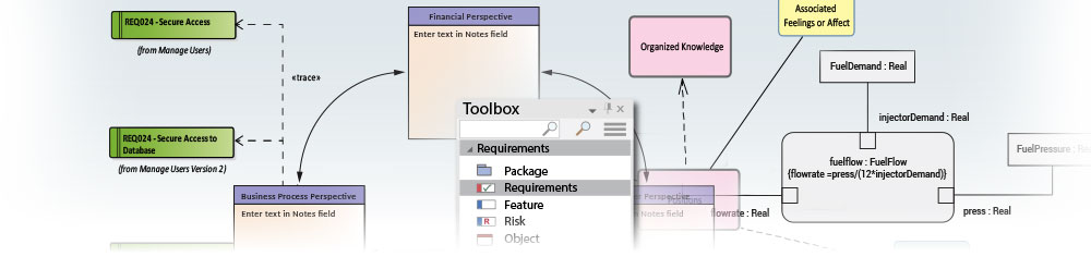 Enterprise Architect allows you to follow any project methodology, whether it is an Agile process or a formal military process or one of the standard frameworks such as TOGAF or Zachman. You are also free to set up your own modeling process, and Enterprise Architect has built in features for defining software development processes. Modeling can start at any point and in real projects it typically doesn’t follow the sequences described in text books; Enterprise Architect allows you to work in a flexible way but supports you with a versatile set of tools.