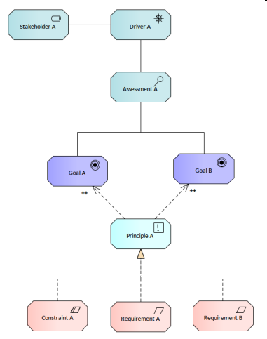The Motivation Viewpoint pattern creates elements and a diagram that completely covers the motivational aspect from a given stakeholder's perspective defining a Driver, an Assessment, a number of Goals and the Principle that is applied and the Requirements and Constrains that are needed to qualify the Principle.