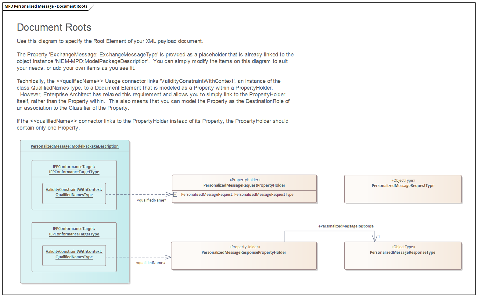 When describing the MPD earlier, we referred to a PropertyHolder that contained the possible document roots for our two messages. Now that we have defined our subset Packages we can define these document roots. Because we are only creating two simple document types, all that is needed is a PropertyHolder and ObjectType for each message. The ObjectTypes link to the types we've selected from the NIEM framework, to describe the contents of each message as shown:
