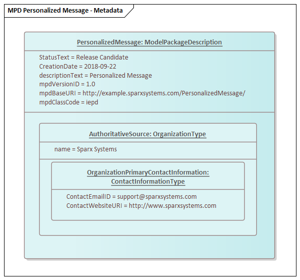 The top level object in the Pattern is an instance of the ModelPackageDescription class. The name of the MPD is the name of the Object itself. All other properties are in the Run-State of the object. This figure shows how the MPD might look after providing real information.