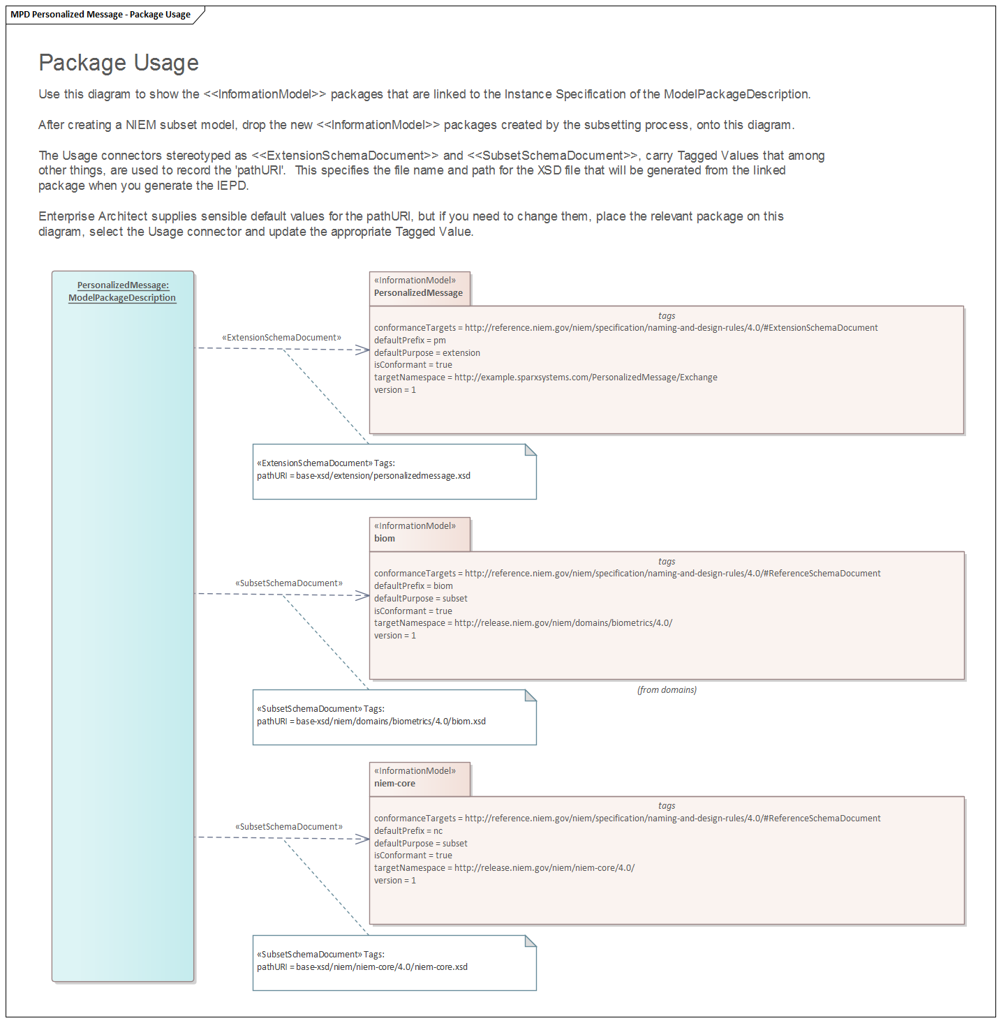 The relationships connecting the Model Package Description to the Information Models specify which schema files are to be generated with this MPD. In this example we will use types from two different NIEM namespaces. To do this, we first create an InformationModel Package for each, where the Namespace Tagged Values match the original, and the purpose is set to subset. We will also need an extension Package where we can define our own types and how the NIEM types will be used. This figure shows how this will look: