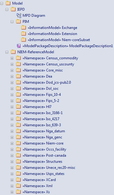 The MDG Technology for NIEM provides a model Pattern from which to build IEPD models. You can apply this Pattern in your NIEM project, using the Model Wizard.
