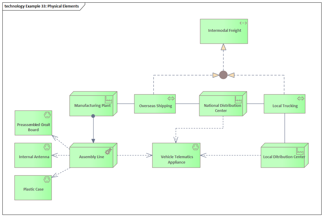 This diagram is concerned with Physical things that are important to the Architecture, including Facilities, Equipment, Distribution Networks and Material. We see two other elements that the modeler has used; one is Path from the Technology Layer and the other is Location, which is a Composite element. The diagram describes what is being produced at a Manufacturing Plant modeled as a Facility, and the logistics in the form of Shipping of overseas items and trucking for domestic items to move the assembled items to local and national Distribution Centers.