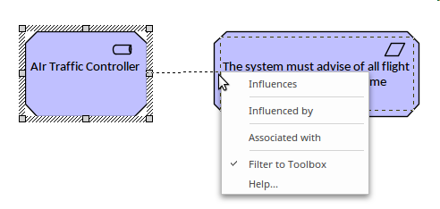 Relationships can be selected from the diagrams toolbox pages which are specific to the diagram or view that is being constructed. The relationship appear in a toolbox page beneath the elements and can be dragged between any two elements or in some cases between an element and a relationship. The relationships can be used with any pair of elements in the repository.