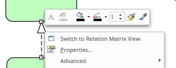 The options to change the style of a relationship are available from a number of locations, including the ribbons and the element Quick Style icon that is displayed when the relationship's context menu is selected in the diagram. This illustration shows the options available from the diagram.