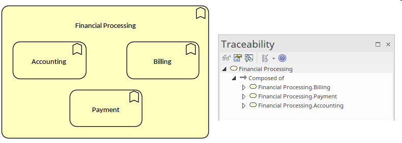 To create nested elements, the relationships between elements must already exist or first be created. A modeler can then use drag-and-drop to nest one or more elements inside another element. Enterprise Architect hides the relationships in the diagram but they are visible through a number of other workspace windows, including the Traceability window, the Relationships window and the 'Details' tab of the Inspector window. This illustration shows the Traceability window when the containing element is selected, clearly showing the Composition relationships that exist in the model; these are not displayed as direct relationships in the diagram but are indicated by the nesting.