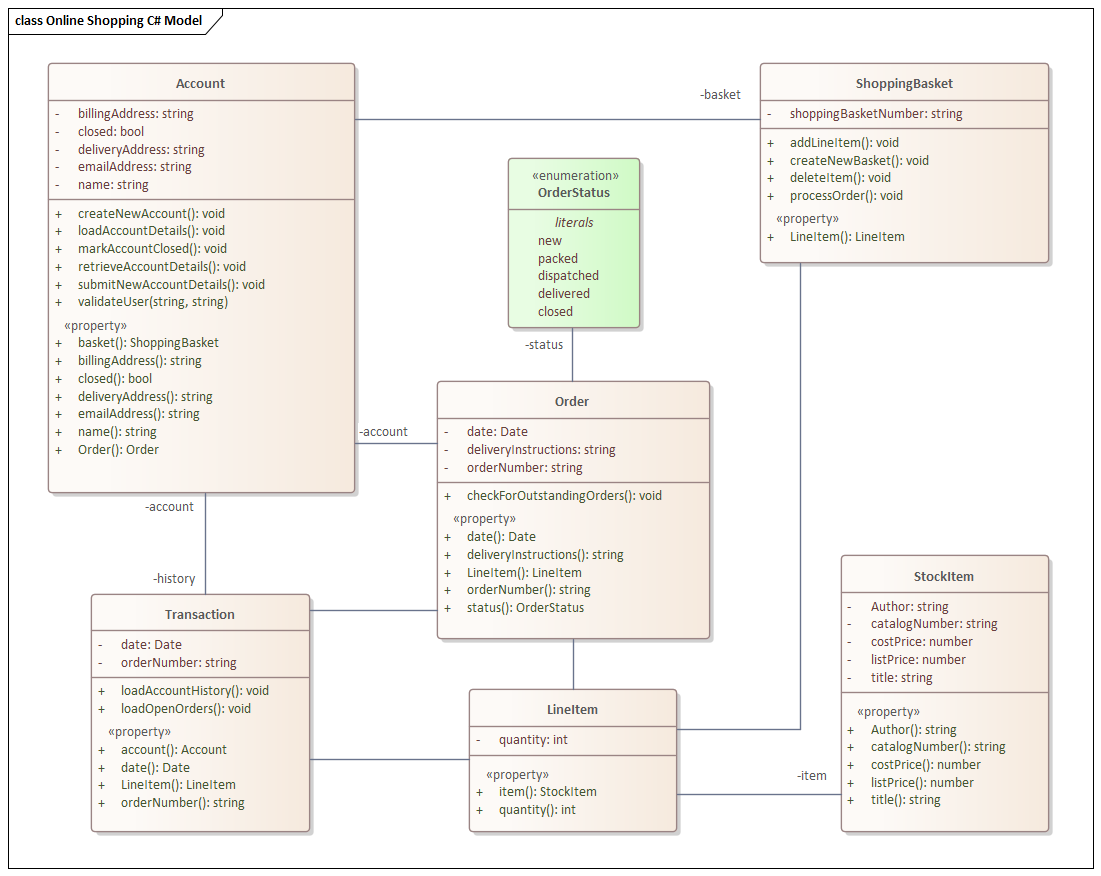 Software diagrams allow you to model the structure and behavior of software including User Interfaces. Enterprise Architect has at its core fundamental support for modelling software and the tool supports a wide range of programming languages and paradigms. In the following diagram we see classes used to model an online shop including Classes that contain compartments for Attributes, Operations and Properties. An Enumeration has also been used to model Order Status.