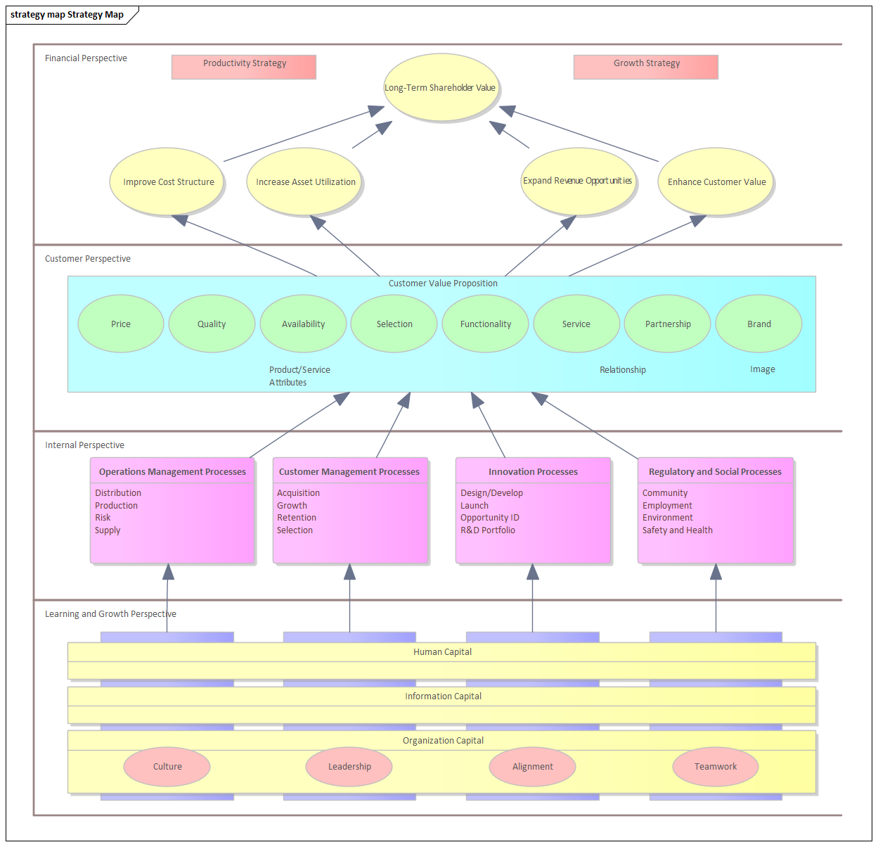Enterprise Architect contains a number of diagram types that are specifically aligned with creating high quality strategic business models. Strategic models are typically defined by executives, modelers and managers responsible for defining strategic direction and both short and long term goals.