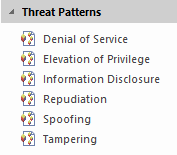 When you open a Trust diagram, the 'Trust Diagram Modeling' page opens in the Diagram Toolbox. This is accompanied by a 'Threat Patterns' page, which contains icons to generate a Threat element and Mitigation Checklist element for each of the STRIDE Threat types (see the Security Threats Taxonomy Based on the STRIDE Methodology section, next). Click on the required pattern icon and drag it onto your diagram to generate the elements. |