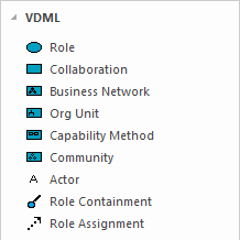 The VDML toolboxes contain the elements and connectors used for each of the diagram types as follows: