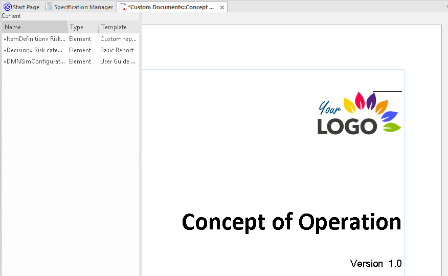 Great flexibility is provided by allowing you to select a document generation template for each item you add to the document. For example, you might add a Stakeholder Package containing a list of Stakeholder elements, and use a template that lists the Stakeholders in separate paragraphs.