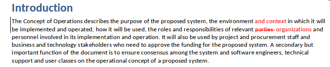 The document edit facilities in Enterprise Architect allow you to work collaboratively with other modelers. One feature that will help you when working with Static text in Custom Documents is Track Changes. This allows you to track the changes as you or others work with the document. This image shows a Static part of the document where Track Changes have been enabled and some text has been changed; the deleted and added text is shown in red.