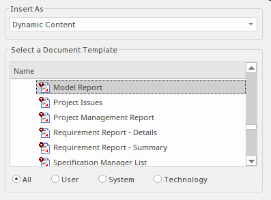 For a model element such as a Package, element or Feature, you can select the (default) option of 'Dynamic Content' in the 'Insert as' field. This adds the object information to the document. The prompt also provides a list from which you can select a template or template fragment to format that specific information within the document. The list of templates can be filtered to present only those that are user-defined, or system-provided, or technology-provided, or to show all available templates. You make your selection by clicking on the appropriate radio button under the list.