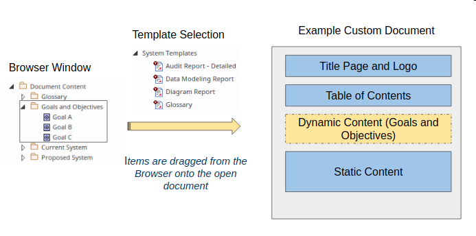 - Type in Static text and drag in Packages, elements, diagrams or Features from the Browser window, as Dynamic content. When you drag Dynamic content into the document, you are prompted to select another template or template fragment so that you can organize the information on that object in a specific format.