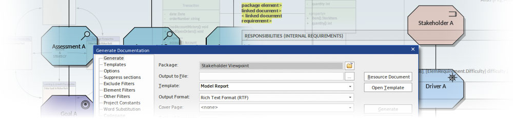 You can generate Document reports in a number of document formats, which you can tailor using templates and Stylesheets to alter the content and appearance of the generated output. Enterprise Architect has a fully-featured document generator that features: