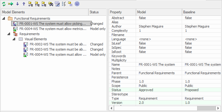 This diagram illustrates the Baseline comparison tool, showing model and Baseline properties; Status and Version have changed.