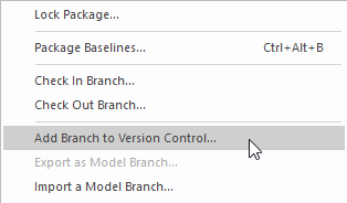 Before you can Check Out a package and begin making changes you or the librarian must first configure the package for Version Control. You simply select the Add Branch to Version Control option and choose an existing configuration. This to adds the package to the Version Control System and places the package in a Checked-In state.