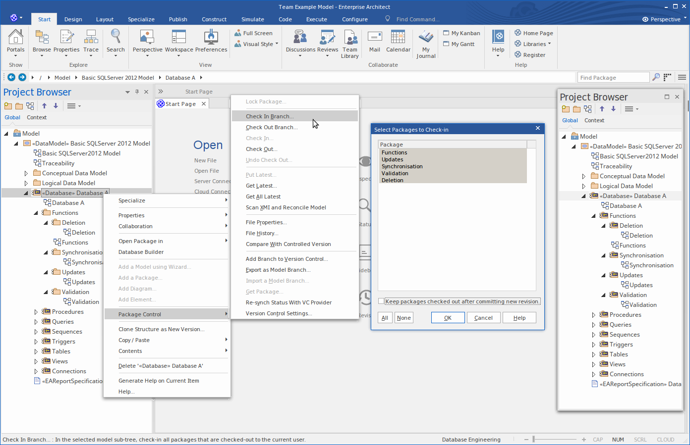 The Version Control feature allows you to check-out a Package, which then locks it so that no other user can modify it until you have checked it back in again. You can then modify the Package, adding new elements and diagrams, changing others and deleting still others. When you have completed your changes and are ready for other modelers to see your work, you can check-in the Package. Other modelers would then need to do a Get Latest to pull the new changes down from the Version Control Server.