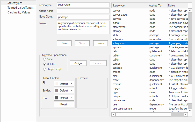 Using the 'UML Types' dialog you can configure stereotypes, Tagged Value Types and Cardinality (Multiplicity) Values for your project. In more detail, you can: