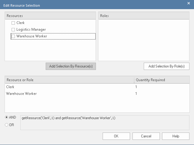 - The top right panel lists the defined Roles (if any) for the Resource elements; click on the required roles and on the to move the selection to the 'Resource or Role' panel