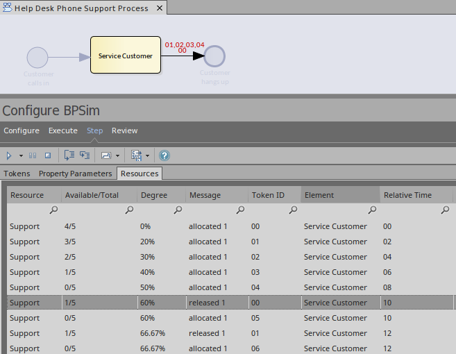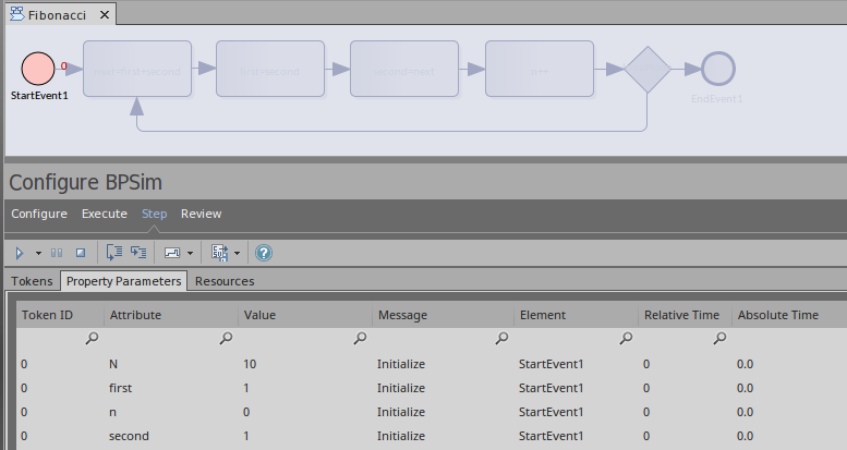 After defining property parameters, configuring BPSim parameters for each element and executing the model, we are ready for the step simulation:
