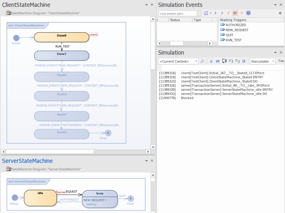 We firstly set up the contexts (the Class elements containing the StateMachines), simulate them in a simple context and raise the event from outside it; then simulate in a client-server context with the Send event mechanism.