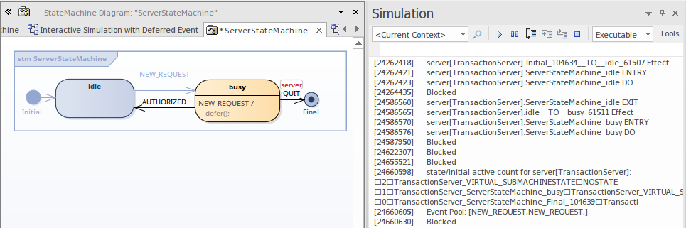 This example shows a model using Deferred Events, and the Simulation Events window showing all available Events.